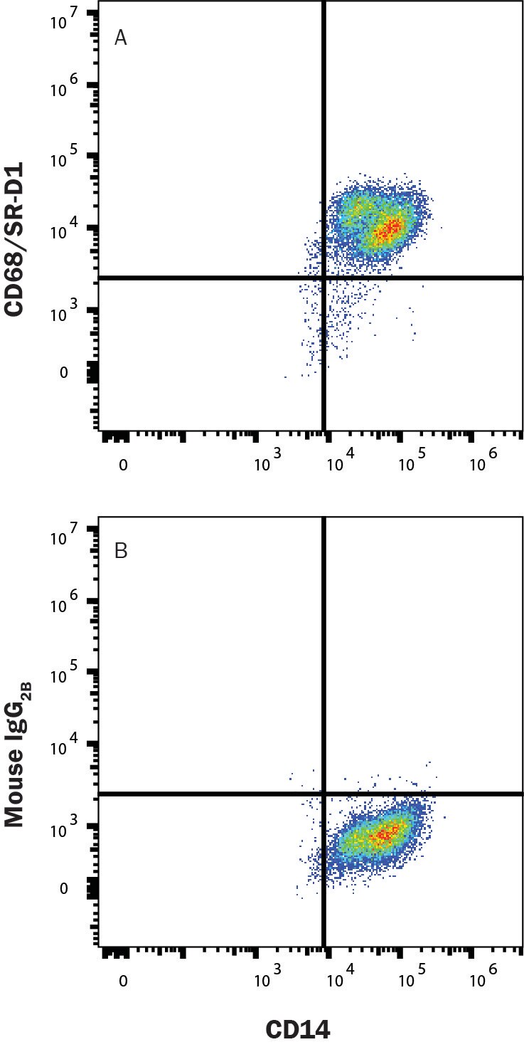 Human CD14+ monocytes were selected from PBMCs using MagCellect Human CD14+ Cell Isolation Kit (MAGH105) and cultured for four days in recombinant human M-CSF (216-MC; 10 ng/mL) then stained with (A) Mouse Anti-Human CD68/SR-D1 APC-conjugated Monoclonal Antibody (Catalog # IC20401A) or (B) isotype control antibody (IC0041A) and Mouse anti-Human CD14 PE-conjugated Monoclonal Antibody (FAB3832P). To facilitate intracellular staining, cells were fixed with Flow Cytometry Fixation Buffer (FC004) and permeabilized with Flow Cytometry Permeabilization/Wash Buffer I (FC005). Staining was performed using our Staining Intracellular Molecules protocol.