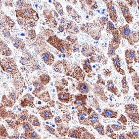 Detection of Procalcitonin in Human Liver. Procalcitonin was detected in immersion fixed paraffin-embedded sections of human liver using Mouse Anti-Human Procalcitonin Monoclonal Antibody (Catalog # MAB11323) at 5 µg/mL for 1 hour at room temperature followed by incubation with the Anti-Mouse IgG VisUCyte™ HRP Polymer Antibody (Catalog # VC001). Before incubation with the primary antibody, tissue was subjected to heat-induced epitope retrieval using VisUCyte Antigen Retrieval Reagent-Basic (Catalog # VCTS021). Tissue was stained using DAB (brown) and counterstained with hematoxylin (blue). Specific staining was localized to cytoplasm in hepatocytes. View our protocol for IHC Staining with VisUCyte HRP Polymer Detection Reagents.