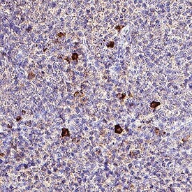 CRACC/SLAMF7 was detected in immersion fixed paraffin-embedded sections of Human Tonsil using Mouse Anti-Human CRACC/SLAMF7 Monoclonal Antibody (Catalog # MAB19061) at 5 µg/mL for 1 hour at room temperature followed by incubation with the Anti-Mouse IgG VisUCyte™ HRP Polymer Antibody (Catalog # VC001). Before incubation with the primary antibody, tissue was subjected to heat-induced epitope retrieval using VisUCyte Antigen Retrieval Reagent-Basic (Catalog # VCTS021). Tissue was stained using DAB (brown) and counterstained with hematoxylin (blue). Specific staining was localized to cytoplasm in lymphocytes. View our protocol for IHC Staining with VisUCyte HRP Polymer Detection Reagents.
