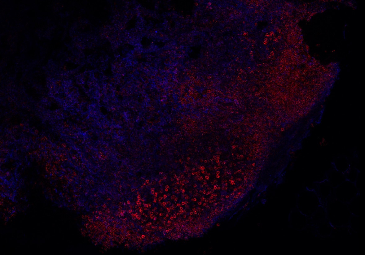 The CXCL13 can be observed in blue while CXCR5+ cells are observed in red