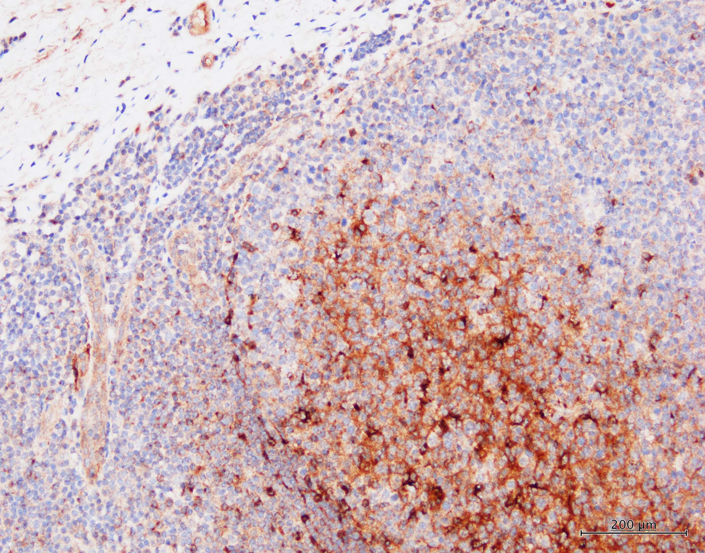 CXCL13/BLC/BCA‑1 in Human Lymphoma. CXCL13/BLC/BCA-1 was detected in immersion fixed paraffin-embedded sections of human lymphoma using Goat Anti-Human CXCL13/BLC/BCA-1 Antigen Affinity-purified Polyclonal Antibody (Catalog # AF801) at 10 µg/mL overnight at 4 °C. Before incubation with the primary antibody, tissue was subjected to heat-induced epitope retrieval using Antigen Retrieval Reagent-Basic (Catalog # CTS013). Tissue was stained using the Anti-Goat HRP-DAB Cell & Tissue Staining Kit (brown; Catalog # CTS008) and counterstained with hematoxylin (blue). Specific staining was localized to cytoplasm. View our protocol for Chromogenic IHC Staining of Paraffin-embedded Tissue Sections.