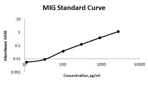 CXCL9, a member of the alpha subfamily of chemokines that lack the ELR domain, was initially identified as a lymphokine-activated gene in mouse macrophages. Human CXCL9 was subsequently cloned using mouse MIG cDNA as a probe. The CXCL9 gene is induced in macrophages and in primary glial cells of the central nervous system specifically in response to IFN-gamma. CXCL9 has been shown to be a chemoattractant for activated T-lymphocytes and TIL but not for neutrophils or monocytes. The human CXCL9 cDNA encodes a 125 amino acid (aa) residue precursor protein with a 22 aa residue signal peptide that is cleaved to yield a 103 aa residue mature protein. CXCL9 has an extended carboxy-terminus containing greater than 50% basic aa residues and is larger than most other chemokines. The carboxy-terminal residues of CXCL9 are prone to proteolytic cleavage resulting in size heterogeneity of natural and recombinant CXCL9. CXCL9 with large carboxy-terminal deletions have been shown to have diminished activity in the calcium flux assay. A chemokine receptor (CXCR3) specific for CXCL9 and IP-10 has been cloned and shown to be highly expressed in IL-2-activated T-lymphocytes. The E. coli-expressed CXCL9 preparations produced at R&D Systems have been shown to contain greater than 80% full length CXCL9.