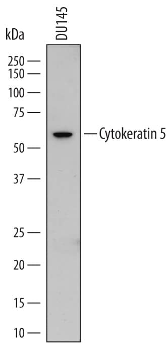 Detection of Human Cytokeratin 5 by Western Blot. Western blot shows lysates of DU145 human prostate carcinoma cell line. PVDF membrane was probed with 0.5 µg/mL of Sheep Anti-Human Cytokeratin 5 Antigen Affinity-purified Polyclonal Antibody (Catalog # AF7564) followed by HRP-conjugated Anti-Sheep IgG Secondary Antibody (Catalog # HAF016). A specific band was detected for Cytokeratin 5 at approximately 58 kDa (as indicated). This experiment was conducted under reducing conditions and using Immunoblot Buffer Group 1.