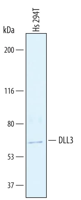 Detection of Human DLL3 by Western Blot. Western blot shows lysates of Hs 294T human melanoma cell line. PVDF membrane was probed with 1 µg/mL of Goat Anti-Human DLL3 Polyclonal Antibody (Catalog # AF4315) followed by HRP-conjugated Anti-Goat IgG Secondary Antibody (Catalog # HAF019). A specific band was detected for DLL3 at approximately 65 kDa (as indicated). This experiment was conducted under reducing conditions and using Immunoblot Buffer Group 1.
