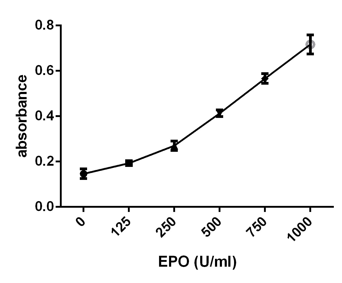 The biological effects of Epo are mediated by the Erythropoietin receptor (Epo R). At the protein sequence level, the human Epo R is approximately 83% identical to the mouse protein. As a result of alternative splicing of the Epo R gene, cDNA clones encoding truncated soluble forms of Epo R have been found. Recombinant soluble Epo R binds Epo with high affinity and is a potent Epo antagonist.