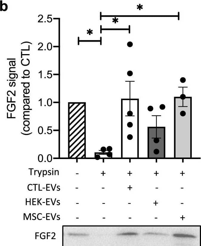 Detection of FGF basic/FGF2/bFGF by Western Blot EV-bound FGF2 is protected from degradation. (A) Effect of EV binding on FGF2 thermal stability. FGF2 (10 ng/ml), alone or after incubation with EVs (8E + 8p) from different cell types for 1 h on ice, was placed at 37 °C for 24 h to challenge FGF2 thermal stability. Residual FGF2 activity was determined by (a) proliferation assay by BrDU incorporation and (b) ELISA assay to measure ESM-1 secretion. EVs from DF, MSC, HEK cells were tested. Results are mean ± SE of four independent experiments. Statistical significance was determined by one-way ANOVA (Dunnett’s multiple test), *< 0.05, **< 0.01, ***< 0.001, ****< 0.0001. (B) Effect of EV binding on FGF2 degradation by trypsin. FGF2 (10 ng), alone or after incubation with EVs from DF, MSC or HEK cells (8E + 8p) for 1 h on ice, was held at 37 °C with trypsin/EDTA (0.05%, diluted 1:2 v/v in 25 μl) for different time periods before loading on western blot to assess residual FGF2 protein. (a) Representative blot with CTL-EVs (b) Representative blot and quantification of FGF2 signal obtained after 10 min incubation with EVs from DF, MSC or HEK cells. Results are mean ± SE of 3–5 independent experiments. Statistical significance was determined by one-way ANOVA (Dunnett’s multiple test), *< 0.05. Original blots are shown in Suppl. Information. Image collected and cropped by CiteAb from the following open publication (https://pubmed.ncbi.nlm.nih.gov/36550142), licensed under a CC-BY license. Not internally tested by R&D Systems.