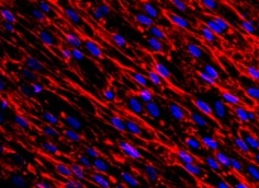 Fibronectin in WS-1 Human Cell Line. Fibronectin was detected in immersion fixed WS-1 human fetal skin fibroblast cell line using 10 µg/mL Mouse Anti-Human Fibronectin Monoclonal Antibody (Catalog # MAB19181) for 3 hours at room temperature. Cells were stained with the NorthernLights™ 557-conjugated Anti-Mouse IgG Secondary Antibody (red; Catalog # NL007) and counter-stained with DAPI (blue). View our protocol for Fluorescent ICC Staining of Cells on Coverslips.