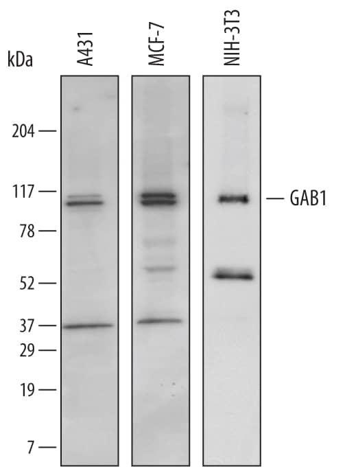 Detection of Human and Mouse GAB1 by Western Blot. Western blot shows lysates of A431 human epithelial carcinoma cell line, MCF-7 human breast cancer cell line, and NIH-3T3 mouse embryonic fibroblast cell line. PVDF membrane was probed with 1 µg/mL of Mouse Anti-Human GAB1 Monoclonal Antibody (Catalog # MAB7077) followed by HRP-conjugated Anti-Mouse IgG Secondary Antibody (Catalog # HAF007). Specific bands were detected for GAB1 at approximately 110 kDa (as indicated). This experiment was conducted under reducing conditions and using Immunoblot Buffer Group 1.