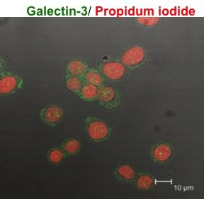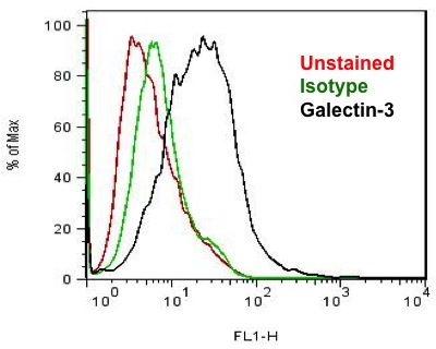 Galectin-3, also known as Mac-2, L29, CBP35 and epsilon BP, is a member of a large family of carbohydrate-binding proteins with specificity for N-acetyl-lactosamine-containing glycoproteins. At least 14 mammalian galectins, which share structural similarities in their carbohydrate recognition domains (CRD), have been identified to date. Galectin-3 is expressed in tumor cells, macrophages, activated T cells, osteoclasts, epithelial cells and fibroblasts.