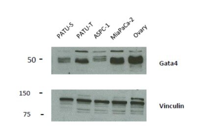 75ug of protein from PDAC cell lines and 50 ug of protein from mouse ovary were loaded and incubated overnight at 1:1000 dilution with Gata4 antibody (AF2606). HRP-conjugated rabbit Anti-Goat IgG Secondary Antibody Rabbit was used . Vinculin was used as a loading control.