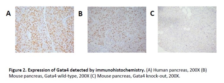 (A) Human pancreas, 200X (B) Mouse pancreas, Gata4 wild-type, 200X (C) Mouse pancreas, Gata4 knock-out, 200X.