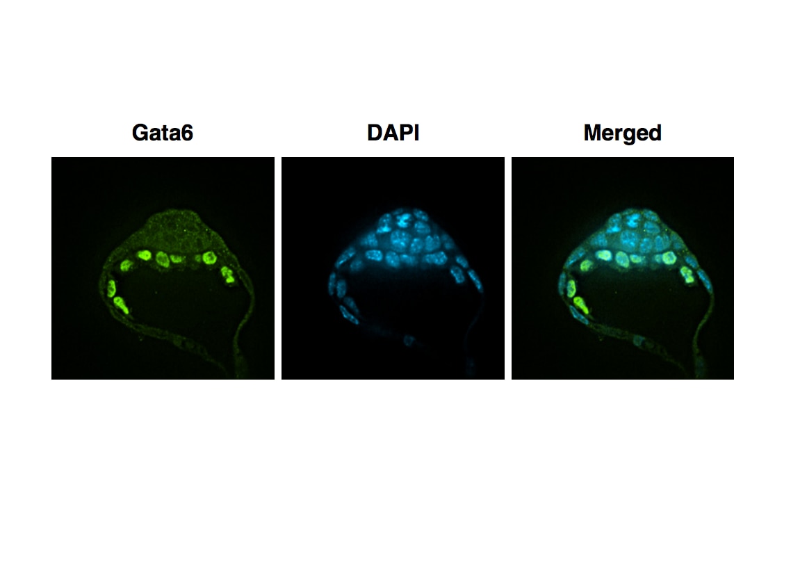 Detection of Mouse GATA-6 by Immunocytochemistry/Immunofluorescence expression of primitive endoderm cell fate markers gradually increased and nanog decreased in developing embryoid bodies.Embryoid bodies were produced from R63 mES cells using the hanging drop method. Development of the embryoid body was monitored over ten days. (A) Light microscopy images show the gradual increase in size of the embryoid bodies as well as increased heterogeneity, loss of circularity and formation of cystic cavities at later timepoints. Scale bars 200 µm. (B) Whole-mount immunostaining showing nuclear localisation of Gata6, Gata4, and Hnf4 alpha on days 3, 5, 7, and 10 of embryoid body development. The percentage of positive nuclei for each protein is shown graphically. The number of positive nuclei increased, reaching a maximum on day 7. (C) Whole-mount immunostaining showing nuclear localisation of Nanog. The number of positive nuclei rapidly decreased, with no positive cells seen on days 7 or 10. The percentage of positive nuclei for each protein is shown graphically. Data is from at least 3 independent experiments, error bars are standard error of the mean (SEM). Statistical analysis is a one-way Anova with a Tukey’s post-hoc test, (*P = 0.1–0.5, **p = 0.001–0.01, ***p<0.001). Dotted lines represent position that the relevant orthogonal or aerial images were taken. Scale bars 10 µm. Image collected and cropped by CiteAb from the following publication (https://dx.plos.org/10.1371/journal.pone.0095434), licensed under a CC-BY license. Not internally tested by R&D Systems.