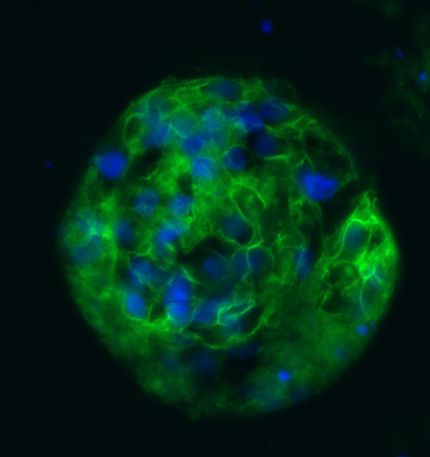 HCN4 in BG01V Human Embyonic Stem Cells. HCN4 was detected in immersion fixed BG01V human embryonic stem cells, undifferentiated (lower panel) and differentiated into cardiomyocytes (upper panel), using Sheep Anti-Human HCN4 Antigen Affinity-purified Polyclonal Antibody (Catalog # AF8138) at 10 µg/mL for 3 hours at room temperature. Cells were stained using the NorthernLights™ 557-conjugated Anti-Sheep IgG Secondary Antibody (red; Catalog # NL010) and counterstained with DAPI (blue). Specific staining was localized to cell surfaces. View our protocol for Fluorescent ICC Staining of Stem Cells on Coverslips.