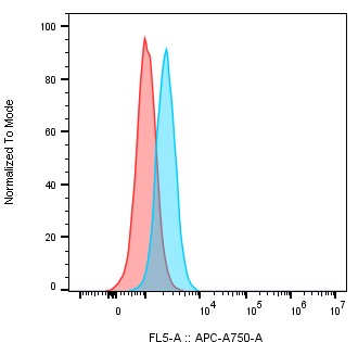 Detection of human HGFR/c-MET on the A431 epidermoid carcinoma cell line. A431 cells were treated with the human HGFR/c-MET Alexa Fluor 750-conjugated antibody (catalog # FAB3582S) (BLUE) or mouse IgG1 Alexa Fluor 750-conjugated isotype control antibody (RED)