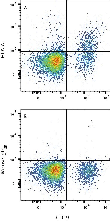 PBMC were stained with Mouse Anti-Human CD19 APC‑conjugated Monoclonal Antibody (Catalog # FAB4867A) and either (A) Mouse Anti-Human HLA Class I Monoclonal Antibody (Catalog # MAB11502) or (B) isotype control antibody (Catalog # MAB004) followed by Phycoerythrin-conjugated Anti-Mouse IgG Secondary Antibody (Catalog # F0102B). View our protocol for Staining Membrane-associated Proteins.