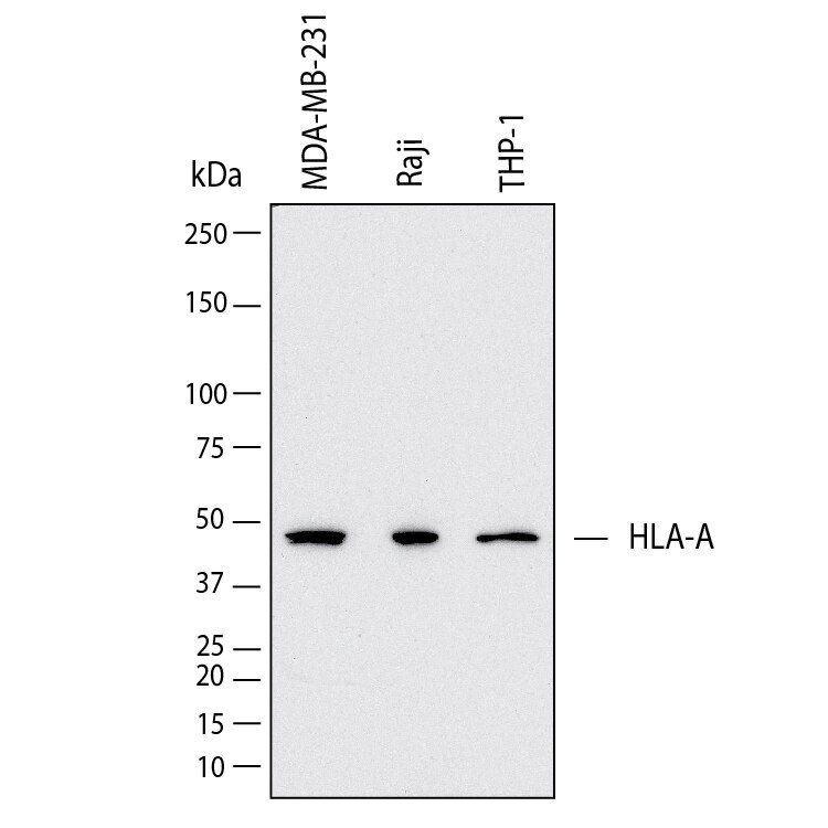 Western Blot shows lysates of MDA‑MB‑231 human breast cancer cell line, Raji human Burkitt's lymphoma cell line and THP‑1 human acute monocytic leukemia cell line. PVDF membrane was probed with 2 µg/ml of Mouse Anti-Human HLA Class I Monoclonal Antibody (Catalog # MAB11502) followed by HRP-conjugated Anti-Mouse IgG Secondary Antibody (Catalog # HAF018). A specific band was detected for HLA Class I at approximately 48 kDa (as indicated). This experiment was conducted under reducing conditions and using Western Blot Buffer Group 1.