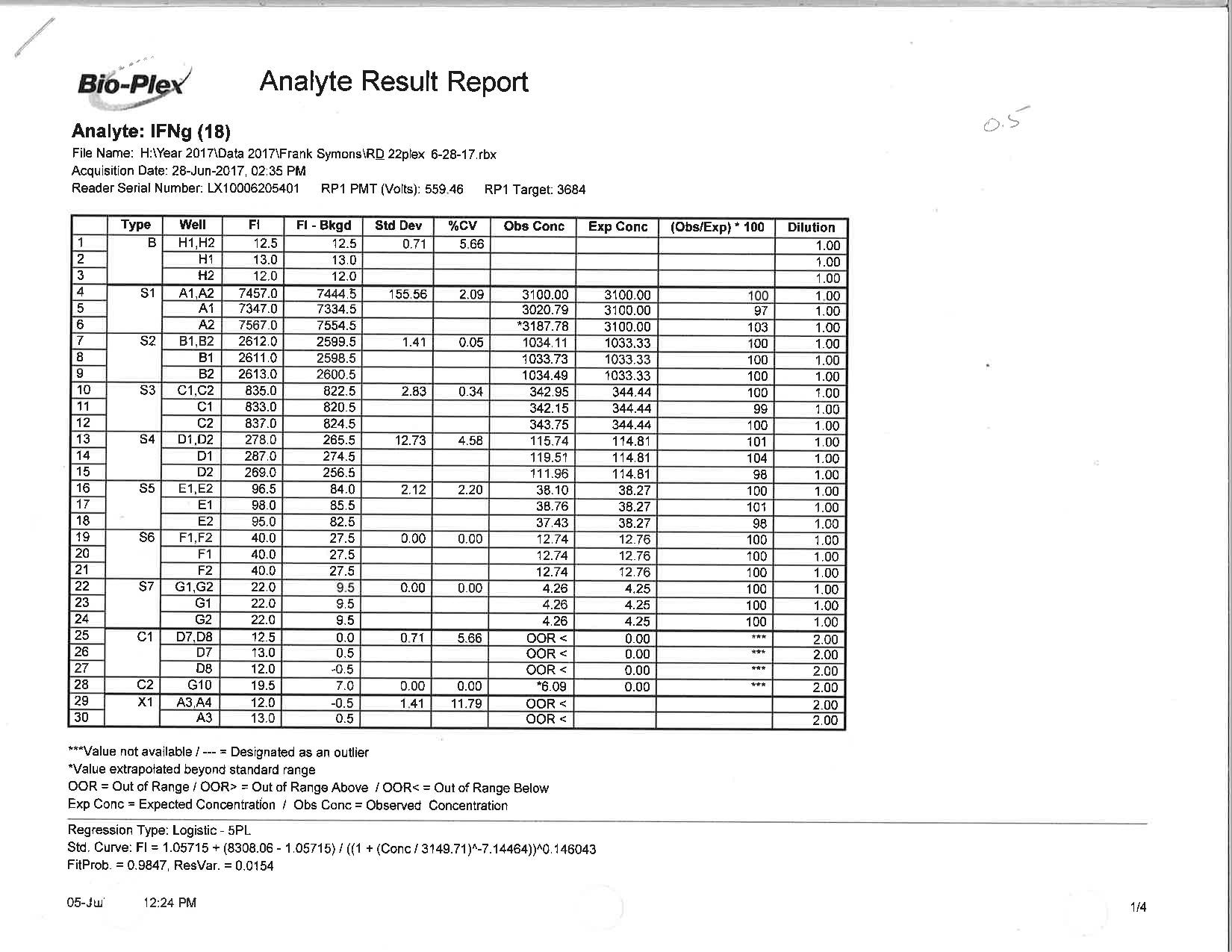 Quantist software graph of signal intensity versus concentration for IFN-gamma in the Human Cytokine A Luminex Panel