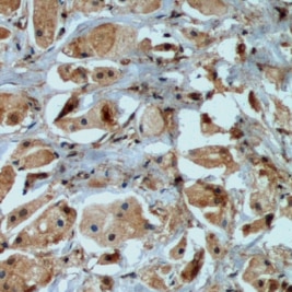 IGFBP‑5 in Human placenta. IGFBP-5 was detected in immersion fixed paraffin-embedded sections of human placenta using 25 µg/mL Human IGFBP-5 Monoclonal Antibody (Catalog # MAB875) overnight at 4 °C. Tissue was stained with the Anti-Mouse HRP-DAB Cell & Tissue Staining Kit (brown; Catalog # CTS002) and counterstained with hematoxylin (blue). View our protocol for Chromogenic IHC Staining of Paraffin-embedded Tissue Sections.
