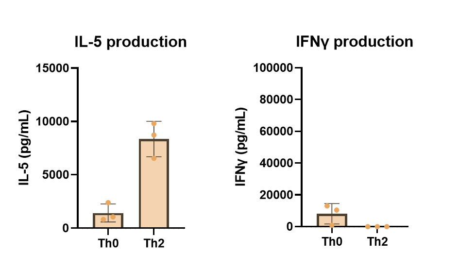 Naive CD4 T cells were stimulated with anti-CD3/anti-CD28 antibodies and polarized with culture media that included 20 ng/mL IL-4, 5 ug/mL anti-IL-12 antibody, and 5 ug/mL anti-IFNg antibody. After 5 days of culture, supernatants were analyzed AlphaLISA to assess IL-5 and IFNg production.