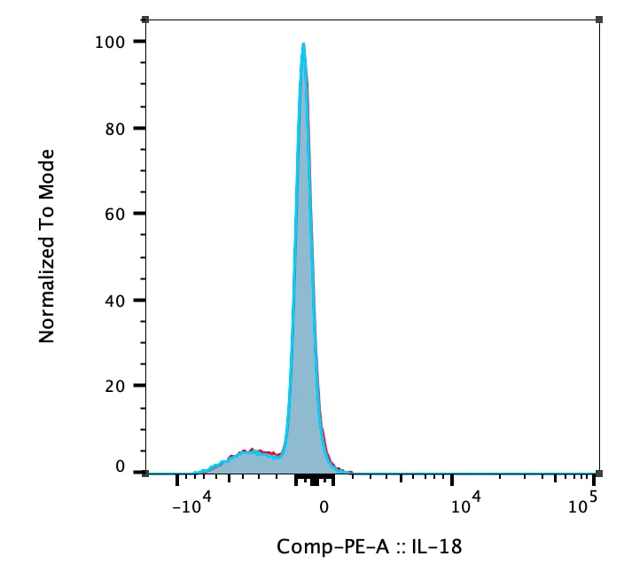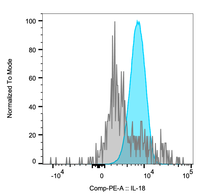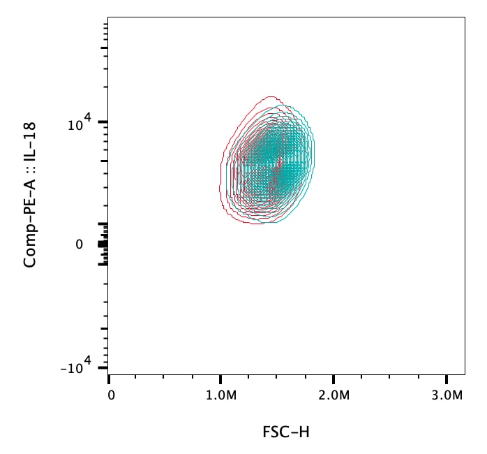 Detection of IL‑18/IL‑1F4 in THP-1 Human Cell Line by Flow Cytometry. THP-1 human monocytic leukemia cell line was stained with Mouse Anti-Human IL-18/IL-1F4 PE-conjugated Monoclonal Antibody (Catalog # IC646P, filled histogram) or isotype control antibody (IC002P, open histogram). To facilitate intracellular staining, cells were fixed with Flow Cytometry Fixation Buffer (FC004) and permeabilized with Flow Cytometry Permeabilization/Wash Buffer I (FC005). View our protocol for Staining Intracellular Molecules.