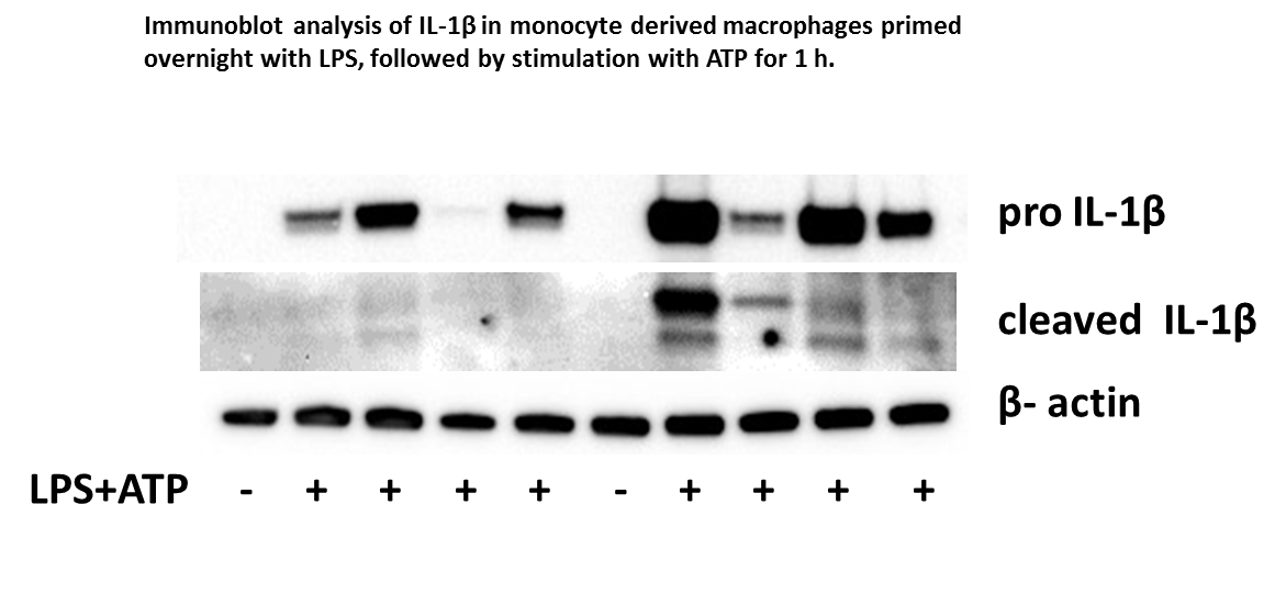 These Abs recognize both pro-IL1b (p31) and active, cleaved form (p17) in cell lysates and conditioned media of activated human monocyte derived macrophages and THP-1 derived macrophages. To see p17 IL-1b I used 10% tricine gel due to small size of detected protein.