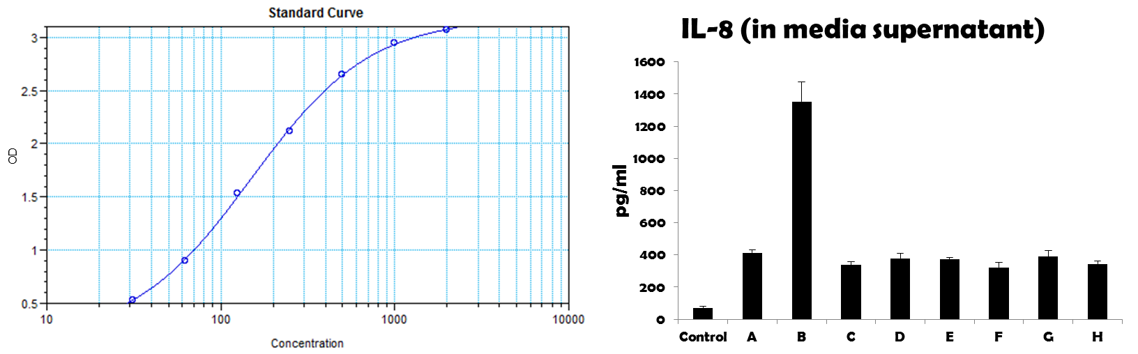 Very nice IL8 detection in HUVEC cells treated with pro-inflammatory stimuli. Slightly higher background in untreated cells than expected, but not overly problematic. Would definitely publish and use again.