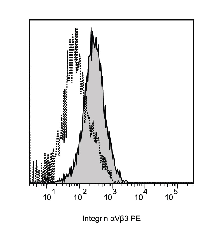 Detection of Integrin alpha V beta 3 in HUVEC Human Cells by Flow Cytometry. HUVEC human umbilical vein endothelial cells were stained with Mouse Anti-Human Integrin aV beta 3 PE-conjugated Monoclonal Antibody (Catalog # FAB3050P, filled histogram) or isotype control antibody (Catalog # IC002P, open histogram). View our protocol for Staining Membrane-associated Proteins.