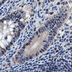 IRF4 was detected in immersion fixed paraffin-embedded sections of human intestine using Mouse Anti-Human IRF4 Monoclonal Antibody (Catalog # MAB55252) at 5 µg/mL for 1 hour at room temperature followed by incubation with the Anti-Mouse IgG VisUCyte™ HRP Polymer Antibody (VC001). Before incubation with the primary antibody, tissue was subjected to heat-induced epitope retrieval using Antigen Retrieval Reagent-Basic (CTS013). Tissue was stained using DAB (brown) and counterstained with hematoxylin (blue). Specific staining was localized to cell nuclei in intestinal glands. Staining was performed using our protocol for IHC Staining with VisUCyte HRP Polymer Detection Reagents.