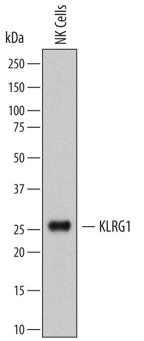Detection of Human KLRG1 by Western Blot. Western blot shows lysates of human NK cells. PVDF membrane was probed with 2 µg/mL of Mouse Anti-Human KLRG1 Monoclonal Antibody (Catalog # MAB7029) followed by HRP-conjugated Anti-Mouse IgG Secondary Antibody (Catalog # HAF007). A specific band was detected for KLRG1 at approximately 25 kDa (as indicated). This experiment was conducted under reducing conditions and using Immunoblot Buffer Group 1.