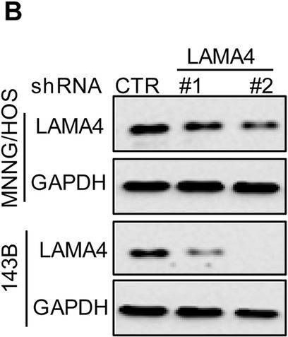 Detection of Laminin alpha 4 by Western Blot Knockdown of LAMA4 suppresses the malignant behaviour of osteosarcoma and accelerates ER stress-induced apoptosis. A The expression levels of LAMA4 in osteosarcoma (n = 88) and normal tissues (n = 564) were analysed from the TNMplot database. B LAMA4 was knocked down in MNNG/HOS and 143B cells. The expression of LAMA4 was detected by Western blot. GAPDH was used as the loading control. C-D The cells (3000 cells/well) with or without LAMA4 depletion were tested for cell growth in the colony formation assay. Viable colonies after 1 week were counted and are shown (C). Data are depicted as bar graphs (D). E-F The migration of the indicated cells was detected by Transwell assays. Representative images of crystal violet-stained culture plates are shown (E). Data are depicted as bar graphs (F). G-H MNNG/HOS cells with or without LAMA4 knockdown were treated with 3 μM TM for 36 h. Cell apoptosis and cell viability were analysed by Western blot (G) and CCK8 assays (H). GAPDH was used as the loading control. I-J MNNG/HOS cells with or without LAMA4 knockdown were treated with 1 μM TG for 36 h. Cell apoptosis and cell viability were analysed by Western blot (I) and CCK8 assays (J). GAPDH was used as the loading control. K-M MNNG/HOS cells (106 cells per mouse) with or without LAMA4 knockdown were injected subcutaneously into nude mice (n = 4). Representative images of xenograft tumours (K). The weights of the tumours were calculated and analysed (L). The expression levels of PARP, cleaved PARP and LAMA4 in tumours were measured by Western blot (M). Data in D, F, H, J, L were analysed by Student’s t test, *p < 0.05, **p < 0.01, ***p < 0.001 Image collected and cropped by CiteAb from the following open publication (https://pubmed.ncbi.nlm.nih.gov/36539799), licensed under a CC-BY license. Not internally tested by R&D Systems.