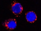 LAMP‑1/CD107a in THP‑1 Human Cell Line. LAMP-1/CD107a was detected in immersion fixed THP-1 human acute monocytic leukemia cell line using Mouse Anti-Human LAMP-1/CD107a Monoclonal Antibody (Catalog # MAB4800) at 25 µg/mL for 3 hours at room temperature. Cells were stained using the NorthernLights™ 557-conjugated Anti-Mouse IgG Secondary Antibody (red; Catalog # NL007) and counterstained with DAPI(blue). Specific staining was localized to cytoplasmic. View our protocol for Fluorescent ICC Staining of Cells on Coverslips.