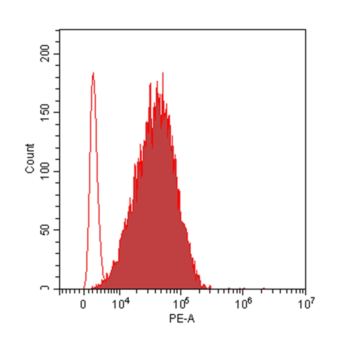 MICB Specificity is Shown by Flow Cytometry in Knockout Cell Line. MICB knockout K562 human myelogenous leukemia cell line was stained with Mouse Anti-Human MICB Monoclonal Antibody (Catalog # MAB1599, filled histogram) or isotype control antibody (Catalog # MAB0041, open histogram) followed by anti-Mouse IgG PE-conjugated secondary antibody (Catalog # F0102B). No staining in the MICB knockout K562 cell line was observed. View our protocol for Staining Membrane-associated Proteins.