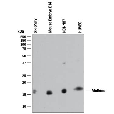 Detection of Human Midkine by Western Blot. Western blot shows lysates of SH-SY5Y human neuroblastoma cell line, mouse embryo tissue, and NCI-N87 human gastric carcinoma cell line. PVDF membrane was probed with 0.5 µg/mL of Rabbit Anti-Human Midkine Monoclonal Antibody (Catalog # MAB258) followed by HRP-conjugated Anti-Rabbit IgG Secondary Antibody (Catalog # HAF008). A specific band was detected for Midkine at approximately 16 kDa (as indicated). This experiment was conducted under reducing conditions and using Immunoblot Buffer Group 1.