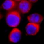 MIS/AMH in LNCaP Human Cell Line. MIS/AMH was detected in immersion fixed LNCaP human prostate cancer cell line using Mouse Anti-Human MIS/AMH Monoclonal Antibody (Catalog # MAB17371) at 25 µg/mL for 3 hours at room temperature. Cells were stained using the NorthernLights™ 557-conjugated Anti-Mouse IgG Secondary Antibody (red; Catalog # NL007) and counterstained with DAPI (blue). Specific staining was localized to cytoplasm. View our protocol for Fluorescent ICC Staining of Cells on Coverslips.