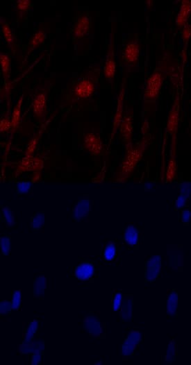 Bcl‑6 in NIH‑3T3 Mouse Cell Line. Bcl-6 was detected in immersion fixed NIH-3T3 mouse embryonic fibroblast cell line using Mouse Bcl-6 Monoclonal Antibody (Catalog # MAB5046) at 10 µg/mL for 3 hours at room temperature. Cells were stained using the NorthernLights™ 557-conjugated Anti-Rat IgG Secondary Antibody (red, upper panel; Catalog # NL013) and counterstained with DAPI (blue, lower panel). Specific staining was localized to nuclei. View our protocol for Fluorescent ICC Staining of Cells on Coverslips.