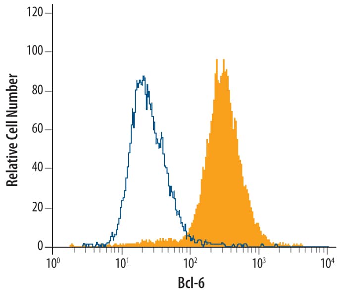 Detection of Bcl‑6 in Raji Human Cell Line by Flow Cytometry. Raji human Burkitt's lymphoma cell line was stained with Mouse Bcl-6 Monoclonal Antibody (Catalog # MAB5046, filled histogram) or isotype control antibody (Catalog # MAB0061, open histogram), followed by Phycoerythrin-conjugated Anti-Rat IgG F(ab')2Secondary Antibody (Catalog # F0105B). To facilitate intracellular staining, cells were fixed with paraformaldehyde and permeabilized with saponin.