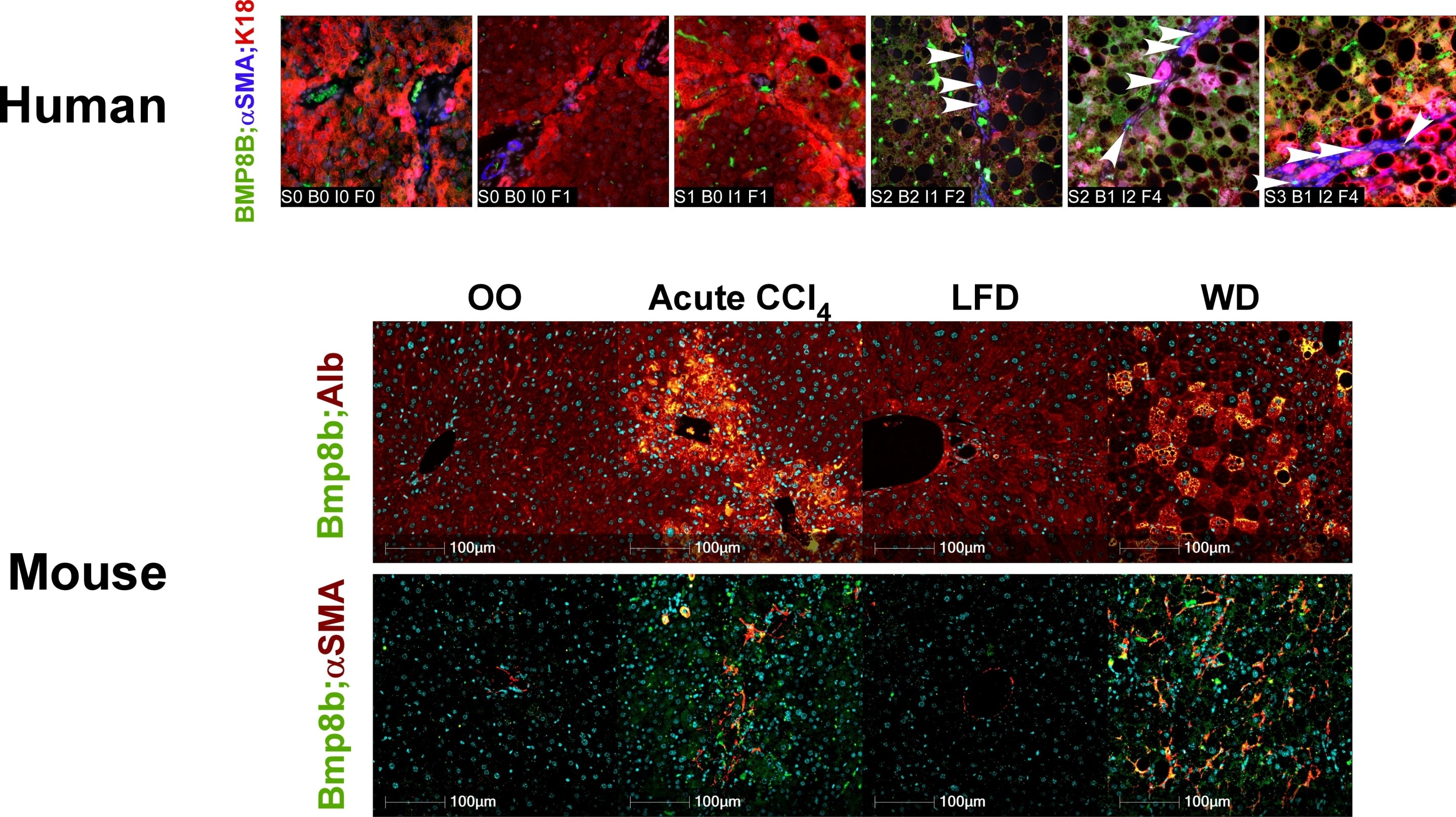 The figures was used to stain with IF BMP8B in human and murine FFPE liver slides with IF. Details of the figures (Fig 1 and Extended Figure 1) and experimental conditions can be found in the published paper: https://www.nature.com/articles/s42255-020-0214-9 where it is shown that BMP8B is expressed in acute and chronic liver disease by hepatocytes (CK18+/Alb+) and Activated Stellate Cells (aSMA+) both in humans and mice.