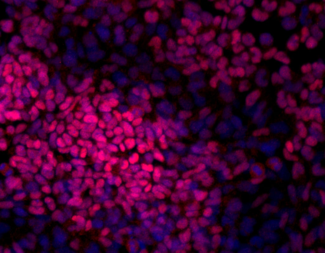 Brachyury in BG01V Human Stem Cells. Brachyury was detected in immersion fixed BG01V human embryonic stem cells differentiated into mesoderm using Goat Anti-Human Brachyury Antigen Affinity-purified Polyclonal Antibody (Catalog # AF2085) at 10 µg/mL for 3 hours at room temperature. Cells were stained using the Northern-Lights™ 557-conjugated Anti-Goat IgG Secondary Antibody (red; NL001) and counter-stained with DAPI (blue). Specific staining was localized to nuclei. View our protocol for Fluorescent ICC Staining of Cells on Coverslips.