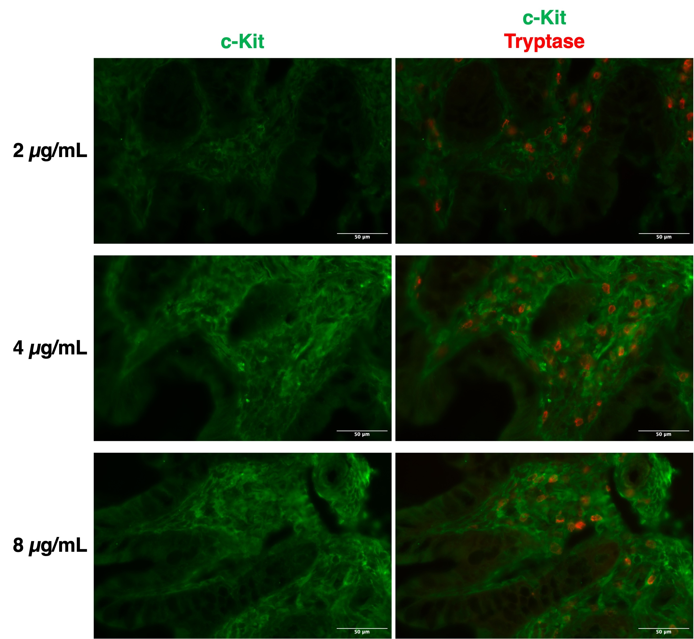 Human ileum fixed in 4% PFA, cryopreserved in 30% sucrose and frozen. No specific staining in mast cells (tryptase+), which should express c-kit