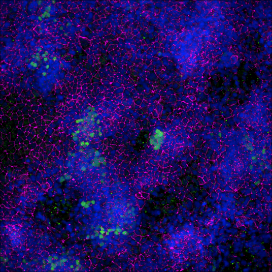 E‑Cadherin in Mouse Intestinal Organoids. E-Cadherin was detected in immersion fixed mouse intestinal organoids using Goat Anti-Human/Mouse E-Cadherin Antigen Affinity-purified Polyclonal Antibody (Catalog # AF748) at 10 µg/mL for 3 hours at room temperature. Cells were stained using the NorthernLights™ 493-conjugated Anti-Goat IgG Secondary Antibody (green; Catalog # NL003) and counterstained with DAPI (blue). Specific staining was localized to cell surfaces. View our protocol for Fluorescent ICC Staining of Cells on Coverslips.