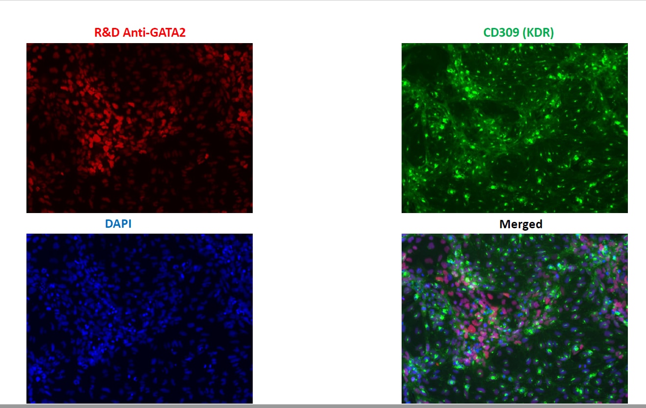 Detection of Mouse GATA-2 by Western Blot RNA-seq identifies the targets of GATA2 in primary human LECs. (A) Principal component analysis (PCA) was performed on RNA-seq data from control shRNA- and shGATA2-infected primary HLECs. A high level of similarity was observed within the groups as indicated by their proximity to each other. (B) Hierarchical clustering shows that approximately 1000 genes were consistently downregulated and 600 genes were upregulated in shGATA2-treated HLECs. (C) GO revealed a list of genes that are likely relevant to the phenotypes observed in mice lacking GATA2. (D) GATA2 was knocked out from a second HLEC line using CRISPR/Cas9. Western blot revealed the lack of GATA2 in the knockout cells (HLEC delta GATA2). In contrast, no obvious differences were observed in the expression of PROX1. Additionally, qRT-PCR revealed the downregulation of miR-126. (A) n=3 independent experiments per shRNA; (D) n=3 independent experiments (antibiotic selection, western blot and qRT-PCR). **P<0.01. Image collected and cropped by CiteAb from the following publication (https://pubmed.ncbi.nlm.nih.gov/31582413), licensed under a CC-BY license. Not internally tested by R&D Systems.