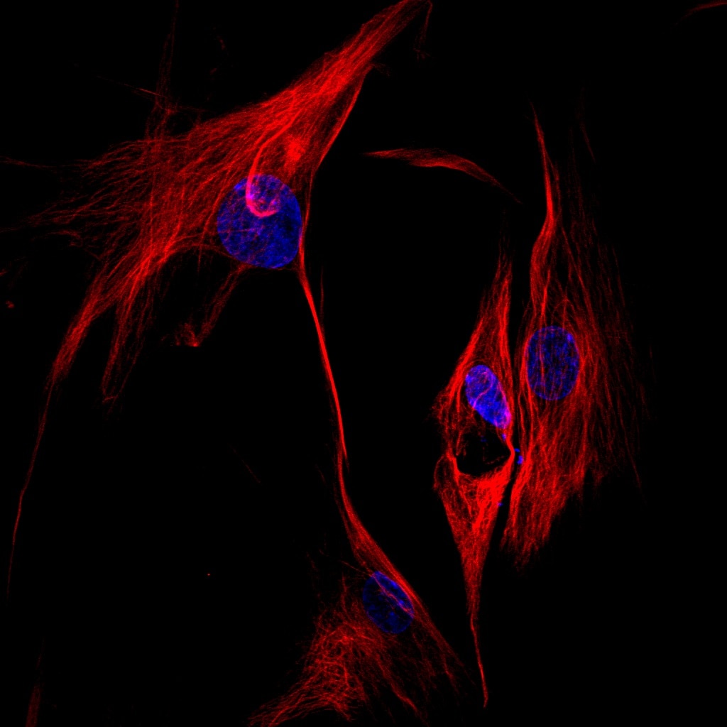 Paraformaldehyde-fixed fibroblast stained with alpha tubulin (red), and counterstained with DAPI