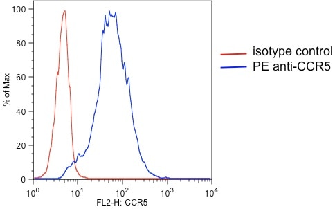 Human CCR5-transfected MOLT4 cells were stained with either a PE-conjugated isotype control or the anti-CCR5 antibody. Staining was performed at room temperature for 10 minutes using the dilution and buffers stated above.