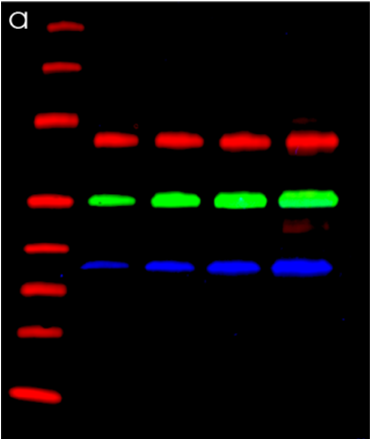 The blot contains HeLa cell lysate (1, 2, 3 and 5 µg) spiked with 200 ng of human transferrin per lane. Transferrin is detected in the red channel, tubulin is detected in the green channel and GAPDH is detected in the blue channel.