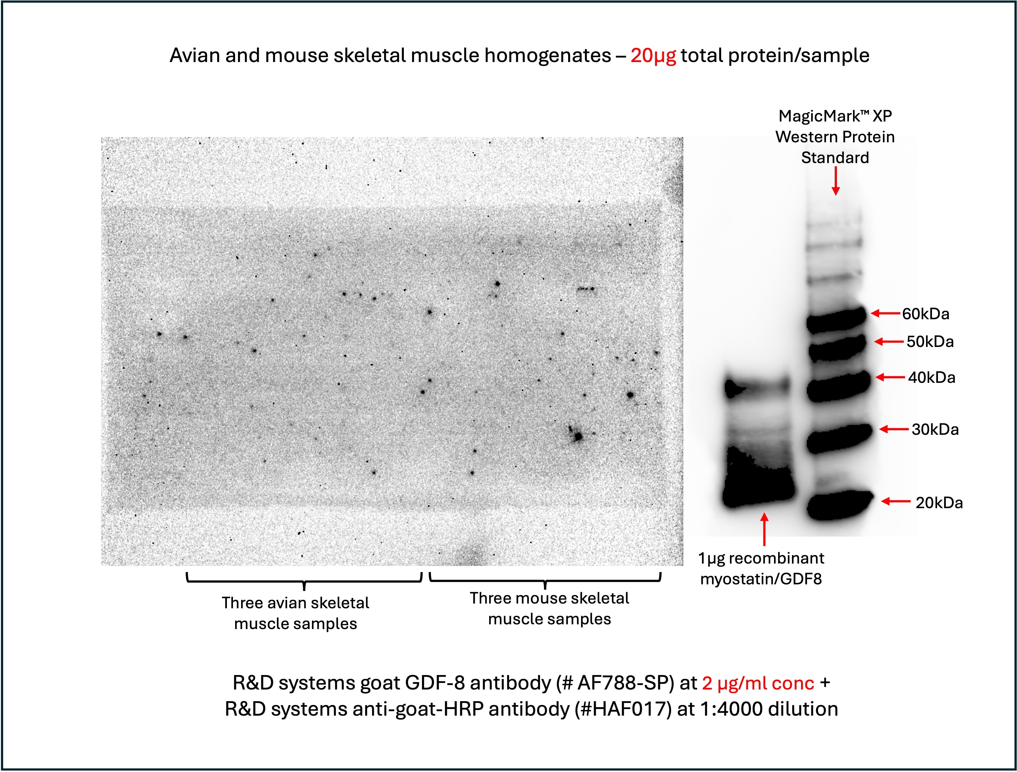 I had repeated the same experiment above three times with increasing concentrations of primary antibody - 0.1, 0.25 and 2 µg/mL. However, all three experiments yielded the same result - strong signal for the recombinant GDF-8/Myostatin, but no visible signal detected with the avian and mouse tissue samples.
