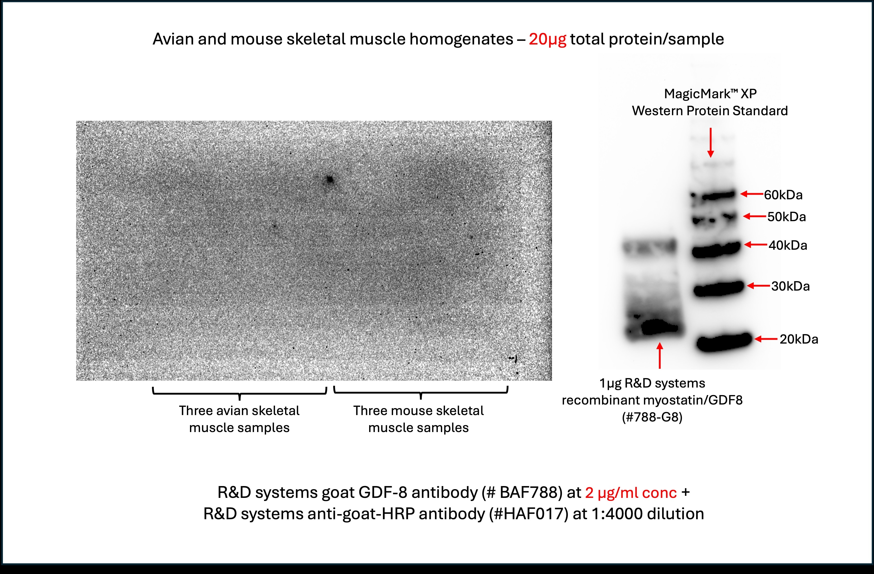 I had repeated the same experiment above three times with increasing concentrations of primary antibody - 0.1, 0.25 and 2 µg/mL. However, all three experiments yielded the same result - strong signal for the recombinant GDF-8/Myostatin, but no visible signal detected with the avian and mouse tissue samples.