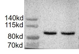 Lane 1:Human recombinant importin beta, showing between the 100KDa and 75 KDa bands.
