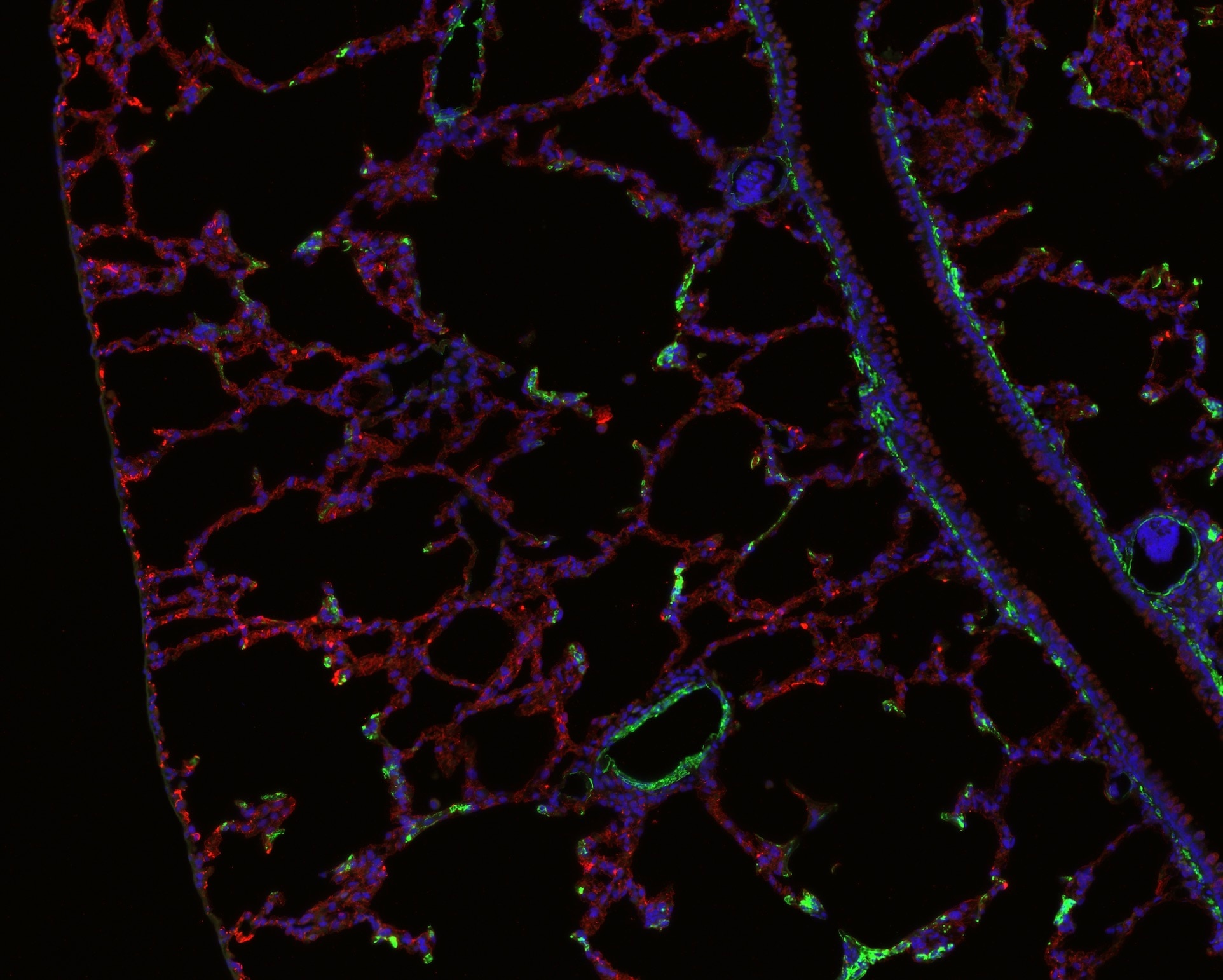 RAGE in Rat Lung. Native rat lung tissue stained for RAGE/AGER (red) and Acta2 (green). Image from a verified customer review.