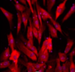 SOX2 in ADLF1 and FAB2 Stem Cell Lines. SOX2 was detected in immersion fixed ADLF1 (top panel) and FAB2 (bottom panel) induced pluripotent stem cell lines using Goat Anti-Human/Mouse/Rat SOX2 Antigen Affinity-purified Polyclonal Antibody (Catalog # AF2018) at 10 µg/mL for 3 hours at room temperature. Cells were stained using the NorthernLights™ 557-conjugated Anti-Goat IgG Secondary Antibody (red; NL001) and counterstained with DAPI (blue). Specific staining was localized to nuclei. View our protocol for Fluorescent ICC Staining of Stem Cells on Coverslips.
