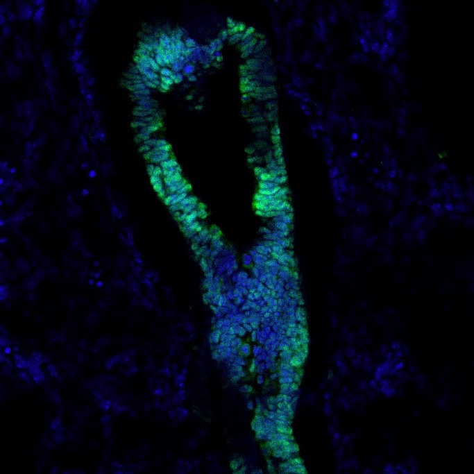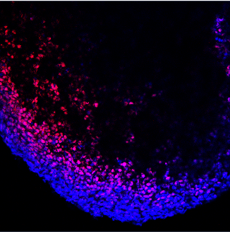 Fetal rat lung stained for Sox2 (red), co-stained with DAPI (blue)